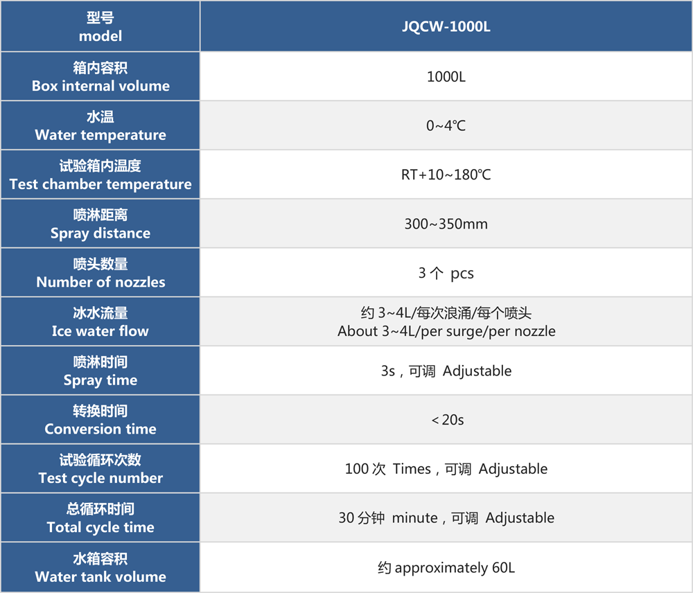 產品型號:JQCW-1000L 品牌:劍 喬 用途:冰水沖擊試驗(浪涌水的溫度沖擊試驗)是模擬部件在駛過積水時而產生的浪涌水的負荷情況,保證部件由于水而急劇冷卻情況下的功能穩定性。如車輛在冬季有水路面駕駛時冰水濺落到熱的系統/組件上,失效模式為不同的溫度膨脹系數導致的材料機械破裂或密封失效咨詢熱線:13829135130